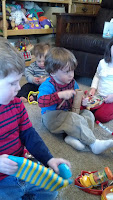 We do many things throughout the days and weeks with the children, but on the third Thursday of every month, Mr. Dave comes for a visit. After engaging the children in conversation for a few minutes, listening to all that the kids want to tell him that he has missed since his last visit, it is his turn to share. He sings familiar songs, brings poems to life, teaches new songs, introduces them to music and instruments from around the world, and brings his beloved box of instruments for "free jam." At the very end, he sings a lullaby and most of the children lay down for this relaxing song. These are a few of the pictures from the last visit.